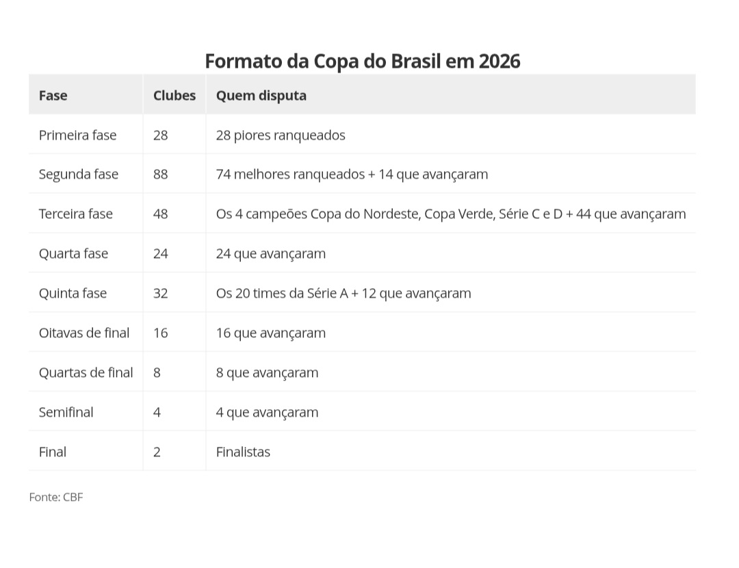 A Copa do Brasil também terá mudanças. O maior torneio eliminatório do país passará de 92 para 126 participantes em 2026 — em 2027, serão 128 clubes. A competição encerrará o calendário do futebol brasileiro, com uma final em jogo único no dia 6 de dezembro do ano que vem.
