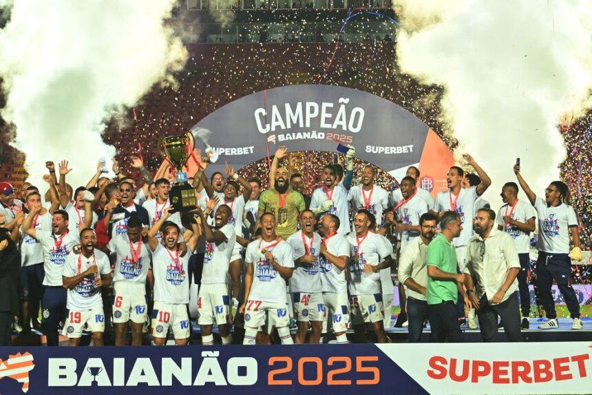 BA - SALVADOR - 23/03/2025 - BAIANO 2025, VITORIA X BAHIA - Jogadores do Bahia comemoram titulo de campeao durante cerimonia de premiacao apos empate por 1x1 contra o Vitoria em partida no estadio Barradao pela decisao do campeonato Baiano 2025. Foto: Walmir Cirne/AGIF