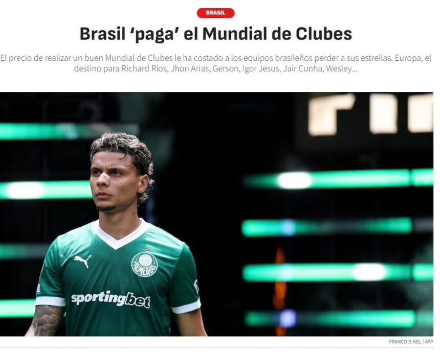 Reportagem desta segunda-feira do diário AS, da Espanha, destacou o que chamou de “custo esportivo” da participação dos clubes brasileiros na Copa do Mundo de Clubes. Segundo a publicação, o torneio funcionou como uma vitrine internacional para Flamengo, Botafogo, Palmeiras e Fluminense, e acabou acelerando a saída de jogadores do país para o futebol europeu.